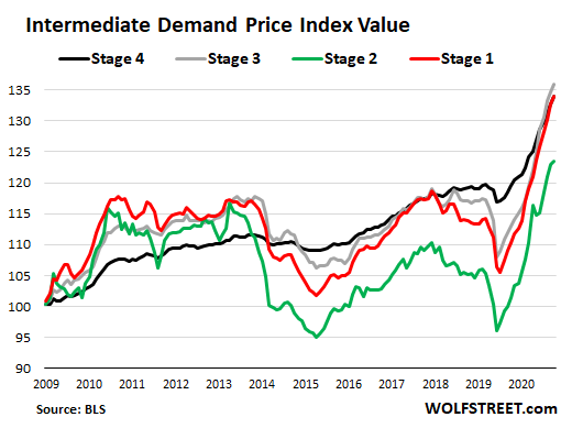 Final demand prices are what consumer prices will encounter pretty soon in their consumer prices. Stage 4 intermediate demand prices will follow. And prices in productions stages 1-3 are further behind, but they’re true whoppers, and they will provide massive pressures on consumer prices for months to come: