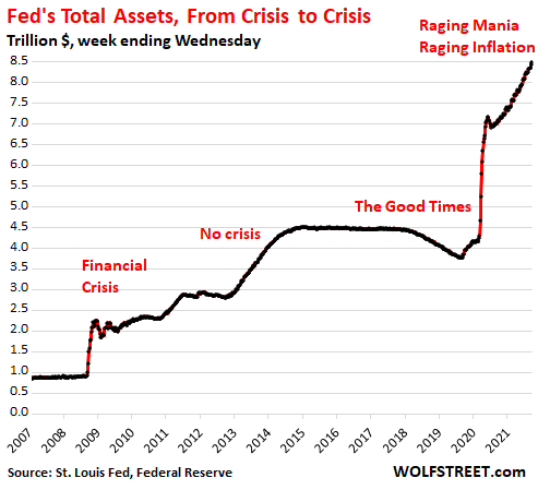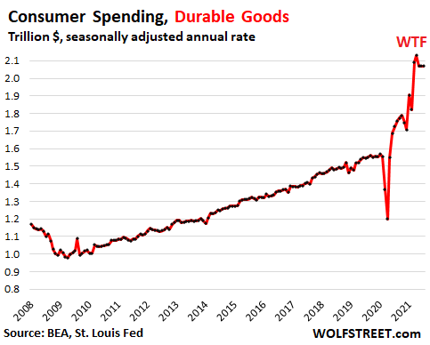 Here’s where: The most grotesquely overstimulated economy ever. The Fed has handed out $4.5 trillion to investors in 18 months, and repressed short-term interest rates to near 0%, and long-term interest rates (via the $120 billion a month in bond purchases) to ridiculously low levels, and this has inflated asset prices, including home prices, and beneficiaries are feeling rich and flush, and they’re going out and borrowing against their assets and buying $70,000 pickup trucks, electronic devices, yachts, second and third homes, and a million other things. That’s where much of the demand comes from.