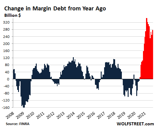 The increase in margin debt has become a huge outlier, compared to prior years, with margin debt ballooning by 42% year-over-year and by 66% in two years, summarized by this chart of year-over-year changes, with the period since March 2020 in red: