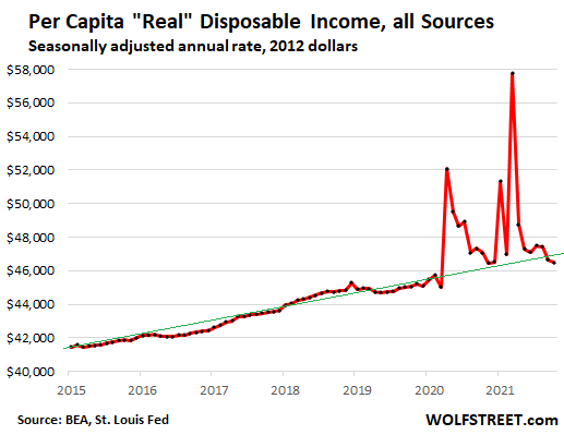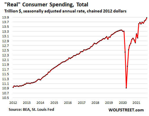 And yet, consumers are outrunning inflation with their spending. Total consumer spending, including for services, and adjusted for inflation – so “real” consumer spending – in October rose by 0.7% from September, and by 6.6% from a year ago: