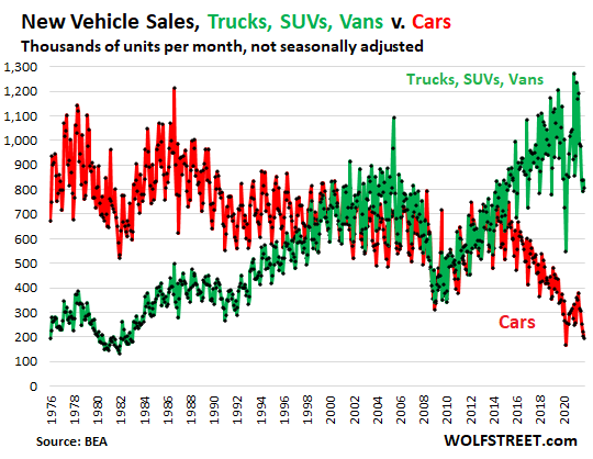 Sales of “cars” have been plunging for years because Americans have lost interest in them and stopped buying them, and the Big Three US automakers, after failing for years to revive interest in them, have abandoned them by killing their sedan models, leaving that segment to Tesla and foreign brands.