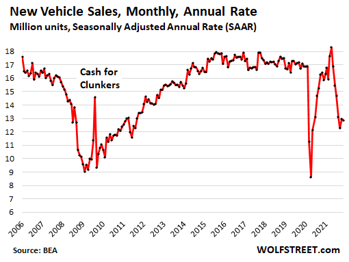 The SAAR for November for all cars and light trucks combined fell to 12.86 million vehicles, according to the Bureau of Economic Analysis today, down 19% from November 2020, and down 25% from November 2019.