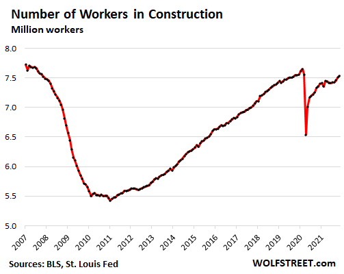 Employment in Construction rose by 43,000, to 7.53 million workers, but was still down by 115,000 from February 2020.