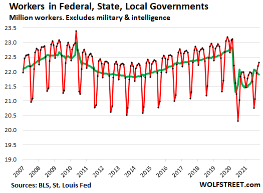 But state and local governments have seen wild fluctuations in employment, a plunge followed by a partial bounce-back that started reversing months ago. Employment at state governments fell by 9,000 in November to 5.03 million. Employment at local governments fell by 18,000 to 14.0 million workers — all seasonally adjusted.