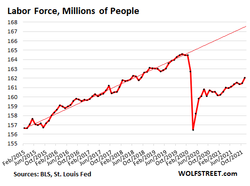 The “labor force” – people who were either already working or who were actively looking for a job in the four weeks prior to the survey of households – jumped by 594,000 people in November from October, seasonally adjusted, the first big increase since April 2021.