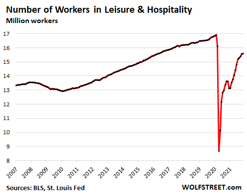 Employment in the leisure and hospitality industry jumped by 170,000 workers in November, to 15.6 million, still down by 1.33 million jobs from February 2020: