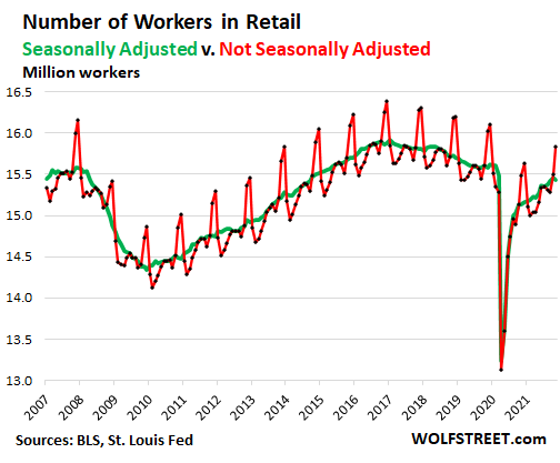 Retail employment. “Not seasonally adjusted,” employment with retailers jumped by 331,600 workers from October, to 15.83 million. But that jump was less than in prior Novembers, and so, after seasonal adjustments, the BLS reported that employment with retailers fell by 20,400 “seasonally adjusted.”