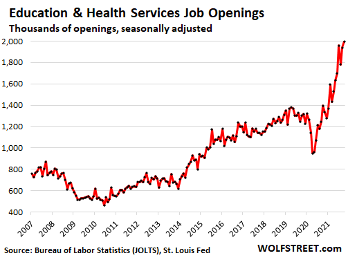 In Education and Health Services, job openings jumped to a record 2.0 million, up by 54% from two years ago:
