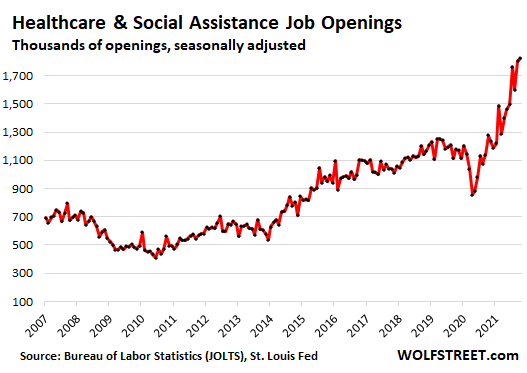 In Healthcare and Social Assistance, job openings jumped to a record 1.82 million, up 55% from October 2019: