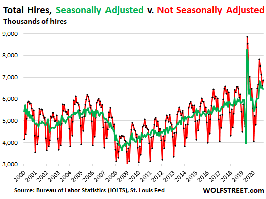 Hiring is very seasonal, driven by large categories such as retail and education that are very seasonal. Despite the labor shortages and the difficulties in hiring people, both seasonally adjusted and not seasonally adjusted hires set big records for October.