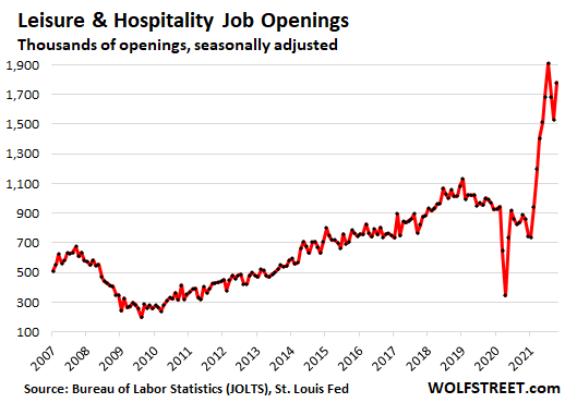 In Leisure and Hospitality – includes restaurants of all kinds, bars, hotels, casinos, art & entertainment – job openings jumped to 1.78 million, the second highest ever, and up by 80% from two years ago.