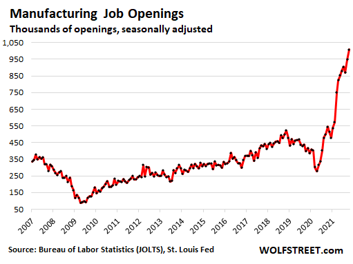 In Manufacturing, job openings spiked to a record 1.01 million (seasonally adjusted). Compared to October two years ago (2019), job openings were up by 153%, as manufacturers struggled with labor shortages, as much as they struggled with materials and components shortages, such as the semiconductor shortage that has slammed automakers and heavy-truck and equipment manufacturers.