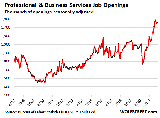 In Professional and Business Services, job openings rose to 1.82 million openings, the third-highest ever, behind July and August, and up 51% from October 2019: