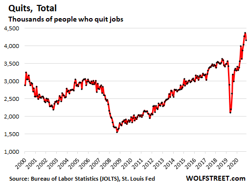 The number of people who quit jobs voluntarily either to work for another company, or to do something else, such as starting up their own business, or staying home to take care of the kids, or whatever, dipped by 92,000 in October from the huge September record, to 4.16 million. October quits were the third-highest ever, and were up by 26% from October 2019: