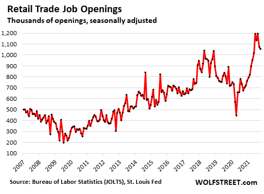 Not seasonally adjusted, job openings in retail rose by 59,000 to 1.24 million, but that increase was smaller than the typical seasonal increase in Octobers, and so the seasonal adjustments reduced that increase to a decline.