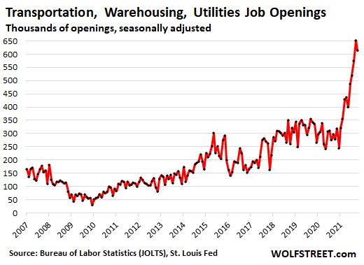 In Transportation, Warehousing, and Utilities, job openings dipped to 614,000 openings, the second highest ever, and up 79% from two years ago. These sectors include many of the workers that move the merchandise coming down the tangled-up supply chains, such as truck drivers, delivery drivers, and warehouse workers.