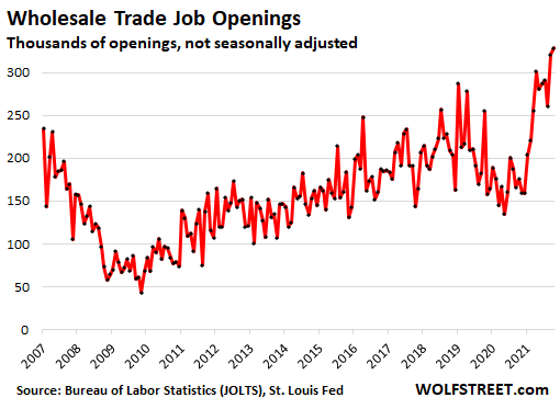In the Wholesale Trade, job openings rose to a record 329,000 openings (not seasonally adjusted), up by 29% from October 2019: