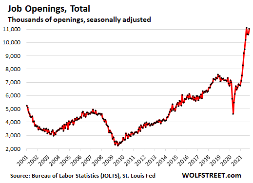 Total Job Openings in October rose again, to 11.03 million (seasonally adjusted), up by 50% or by 3.7 million from October two years ago, after slightly dipping in September and August, to nearly match the blistering record set in June, a testimony to the massive labor shortages still dogging many industries across the US.
