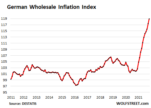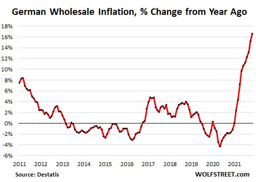 Wholesale prices in Germany – an indicator of what is further up in the pricing pipeline for consumers and businesses – spiked by 16.6% in November, from a year ago, the worst increase in the data going back to 1962, and up from 15.2% in October, and from 13.2% in September, the German statistical office Destatis reported today: