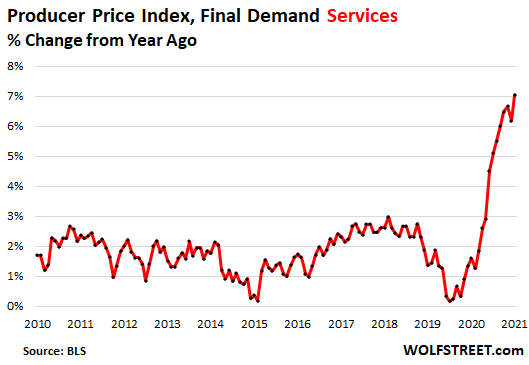 The price index for Final Demand Services jumped by 0.7% in November from October, the 11th month in a row of month-to-month increases, and by 7.1% year-over-year, the highest in the data going back to 2010.