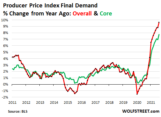 These red-hot price increases up the pipeline in the four stages of Intermediate Demand are increasingly getting passed on to the next industry in line, and the price increases from prior months are now arriving at the Final Demand industries.