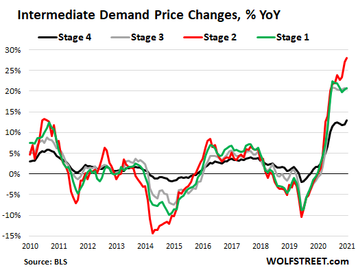 At Intermediate Demand Stage 1 industries, furthest up the pipeline, whose production creates the inputs for industries in Stage 2, prices exploded by 20.8% year-over-year (green line), according to the Bureau of Labor Statistics today. At Stage 2 industries, which create the inputs for industries in Stage 3, prices exploded by 28.1% year-over-year, the worst in the data going back to 2010 (red line). At Stage 3 industries, which create the inputs for Stage 4, prices exploded by 20.6% year-over-year (gray line). And at Stage 4 industries, which create inputs to Final Demand, prices shot up by 12.9% (black line):
