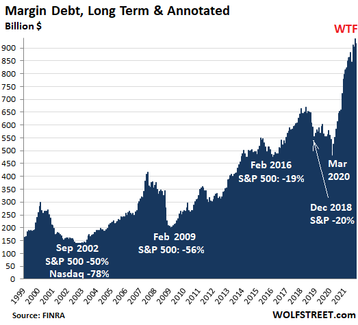 It’s every time the same thing. Ballooning margin debt is the big accelerator on the way up as borrowed money enters the market and creates buying pressure. And when prices begin to unwind, that massive pile of margin debt becomes the big accelerator on the way down.