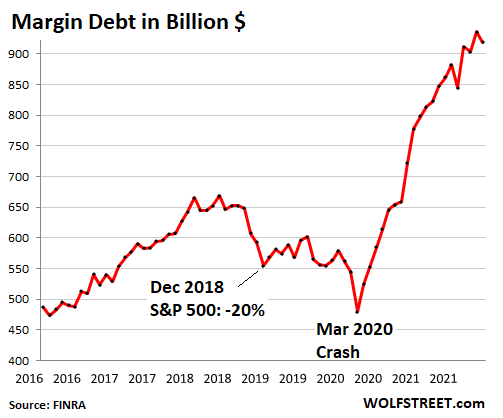 And margin debt, after its historic spike? Stock market margin debt in November fell by $17 billion, from the tip of the spike, to a still monstrous $918.6 billion, still up year-over-year by $197 billion, or by 27%, and up from January 2020 by $357 billion, or by 64%, for one doozie of a spike: