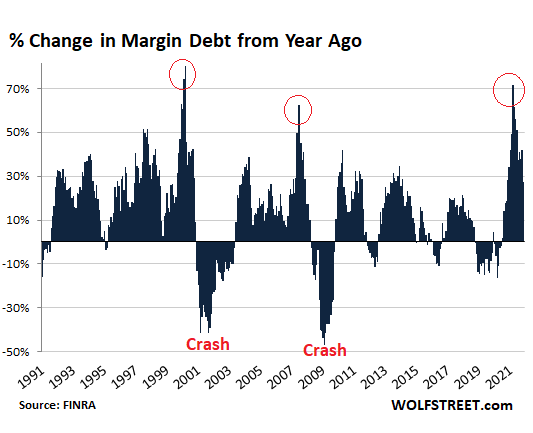 The boom in margin debt was a powerful fuel poured on the stock market over the past 20 months – and it was a huge outlier by historical standards, as the chart below of year-over-year changes in margin debt shows. In terms of dollars, nothing in the data going back to 1991 comes close to the year-over-year increases in margin debt over the past 20 months.