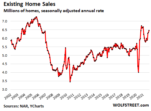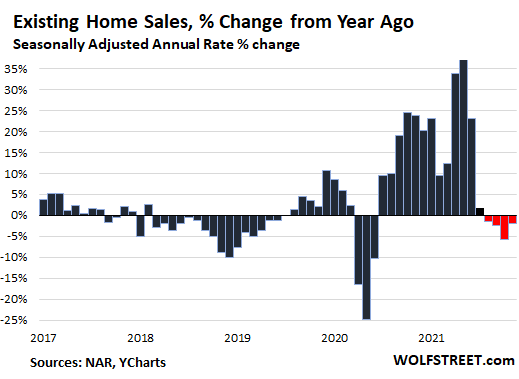 Sales of existing homes of all types – houses, condos, and co-ops – in November ticked up from October, but fell 2% from November last year, to a seasonally adjusted annual rate of 6.46 million homes, the fourth month in a row of year-over-year declines, amid tight supply, according to data from the National Association of Realtors today (historic data via YCharts):