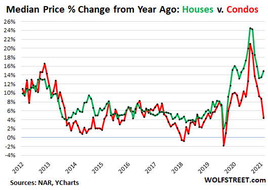 But the median price of condos, at $283,200, was down 8.9% from the peak in June, and up “only” 4.4% year-over-year, the slowest year-over-year increase since May and June 2020, as the heat is coming off the condo market.
