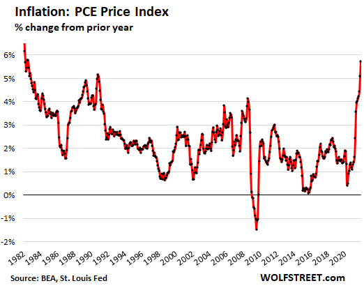 The overall PCE inflation index that includes food and energy, the second-lowest lowball inflation measure the US government produces, spiked by 0.6% in November from October, and by 5.7% year-over-year, the worst reading since 1982.