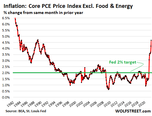 And this “core PCE,” which understates inflation by the most, spiked to 4.7% in November, the worst inflation reading since February 1989, according to the Bureau of Economic Analysis today. Over double the Fed’s inflation target. And the trend doesn’t look good either: