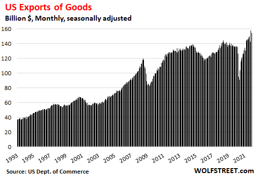 The increase in exports was primarily driven by the 37% surge in exports of industrial supplies, which include petroleum and petroleum products, to $56.7 billion, by far the largest category of exports, accounting for 36.7% of total exports.
