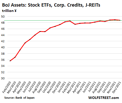 In addition, the BoJ also bought Japanese REITs, corporate paper, and corporate bonds, in even smaller quantities. All combined, stock ETFs, Japanese REITs, corporate paper, and corporate bonds, amounted to ¥48.7 trillion, just a tad below the peak in February 2021. They account for only 6.7% of the BoJ’s total assets: