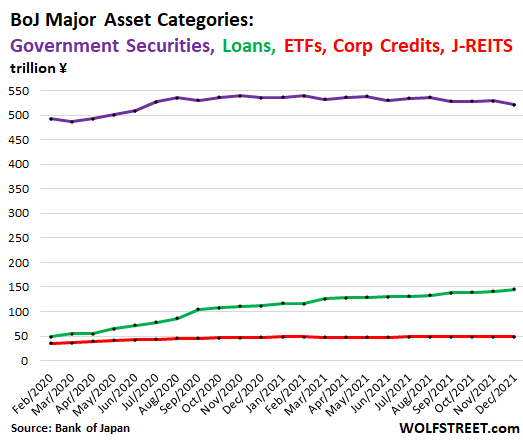 The chart below shows the major asset categories on the BoJ’s balance sheet from February 2020 forward: government securities (purple), loans (green), and the combined total of stock ETFs, J-REITs, corporate paper, and corporate bonds (red line at the bottom):