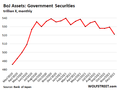 As of its balance sheet for the end of December, released today, the BoJ reduced its holdings of Japanese government securities to ¥521.1 trillion ($4.5 trillion), below where they’d been in July 2020. I started pointing at the end of QE with the release of the August balance sheet when it became apparent what was going on: