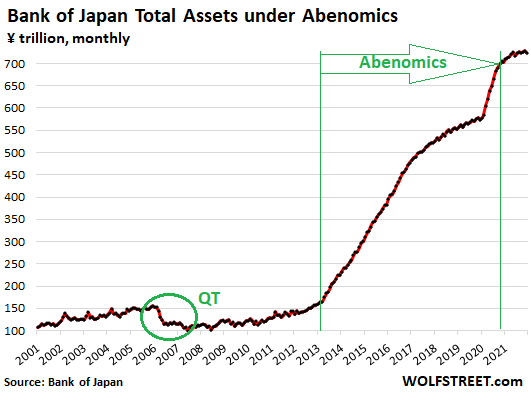 A long-term view of the BoJ’s balance sheet shows the impact of Japan’s national economic religion of Abenomics under Prime Minister Shinzo Abe, which kicked off in early 2013 and ended after Abe’s announcement of his retirement in August 2020, when the BoJ quietly began tapering its asset purchases and ended QE altogether in May 2021: