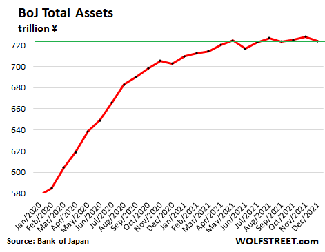 All assets on the BoJ’s balance sheet combined dipped to ¥723.8 trillion ($6.24 trillion) at the end of December, just a tad below where they’d been in May 2021: