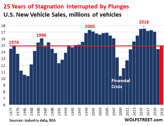 But in terms of sales volume, it was another crappy year. Total new vehicle sales – the number of vehicles delivered to ultimate retail and fleet customers – ticked up about 3.1% from the collapsed levels of 2020, to 14.93 million vehicles, about the same as in 1978, adding another year to the 25-year stagnation interrupted by plunges, where the only thing that’s booming is prices.