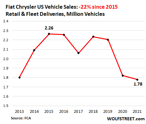 Fiat Chrysler sales 2021: -2.4% from 2020, -22% from 2015. With sales down to 1.777 million vehicles, the automaker, now in the Stellantis group, remained in the Number 4 slot, with Honda and Hyundai-Kia moving in on it.