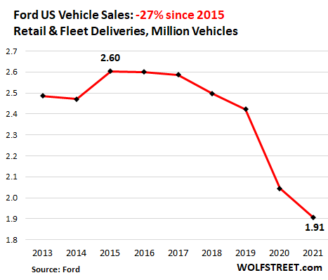 Ford sales 2021: -6.8% from 2020, -27% since 2015. With sales down to 1.905 million vehicles, after a six-year decline that sharply accelerated in 2020 and 2021, Ford, the perennial Number 2, got knocked into the Number 3 slot.