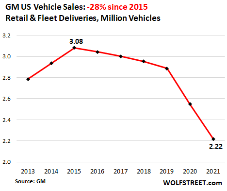 GM sales 2021: -12.9% from 2020, -28% since 2015, a six-year collapse in volume that is hard to grasp. After the multi-year process of declining sales, GM then got slammed by the pandemic in 2020 and by the semiconductor shortage in 2021. With total sales of all its brands at 2.218 million vehicles, GM got kicked into the Number 2 position, behind Toyota: