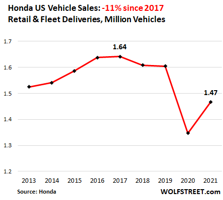 Honda sales 2021: +8.9% from 2020, -10.6% from 2017. With 1.467 million sales, Honda remained in the Number 5 slot, but now just a hair above the combined Hyundai-Kia: