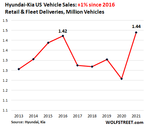 Hyundai-Kia sales 2021: +19.1% from 2020, +1% from 2016, to a new record of 1.439 million vehicles. Hyundai owns a big portion of Kia, and there are numerous cross-shareholding deals between Kia and entities in the Hyundai chaebol. The vehicles share many components. So here, I look at them as two brands of the same automaker.