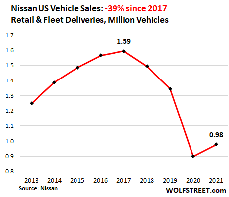 Nissan sales 2021: +8.7% from 2020, -39% since 2017. Of the major automakers, Nissan’s sales collapsed the most. In 2020, sales were down 43% from the peak in 2017. In 2021, sales rose from that catastrophically low level, to 978,000 vehicles, but still below 1 million for the second year in a row.