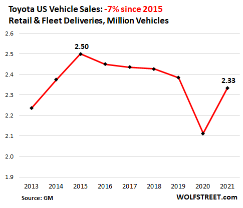 Toyota sales 2021: +10.4% from 2020, -7% since 2015. Toyota too got slammed during 2020, but in 2021, it navigated the chip shortages a lot better than its US counterparts, in part by having made special deals with its key suppliers a decade ago following the collapse of its supply chains due to the earthquake and tsunami in Japan. In 2021, it won the production war and had more vehicles to sell: