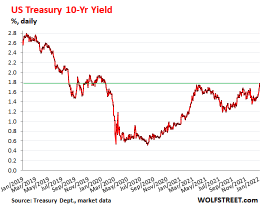 Markets are finally and in baby steps starting to take the Fed seriously. And the most reckless Fed ever – it’s still printing money hand-over-fist and repressing short-term interest rates to near 0%, despite the worst inflation in 40 years – is finally and in baby steps, after some kind of come-to-Jesus moment late last year, starting to take inflation seriously. Treasury yields are now responding: