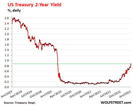 The two-year Treasury yield started rising in late September, from about 0.23%, and ended the year at 0.73%. In the five trading days since then, it jumped to 0.87%, the highest since February 28, 2020. Most of the jump occurred on Wednesday and Thursday, triggered by the hawkish Fed minutes on Wednesday.