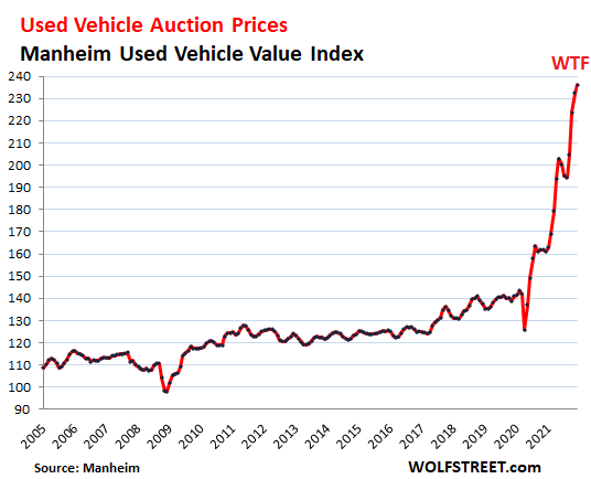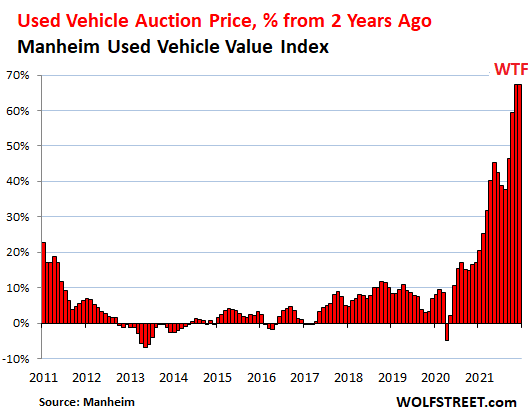 Compared to two years ago, before this craziness kicked in, the Manheim Used Vehicle Value Index spiked by 67.4%, which is of course utter craziness: